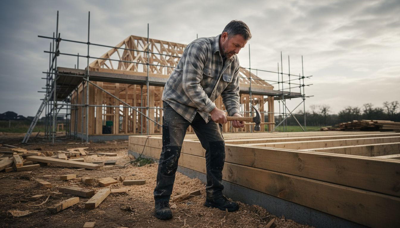 En tømrer bruker både tradisjonelle håndverktøy som hammer og høvel, samt moderne elektriske verktøy som sirkelsager og spikerpistol for presis og effektiv utførelse av arbeidet.